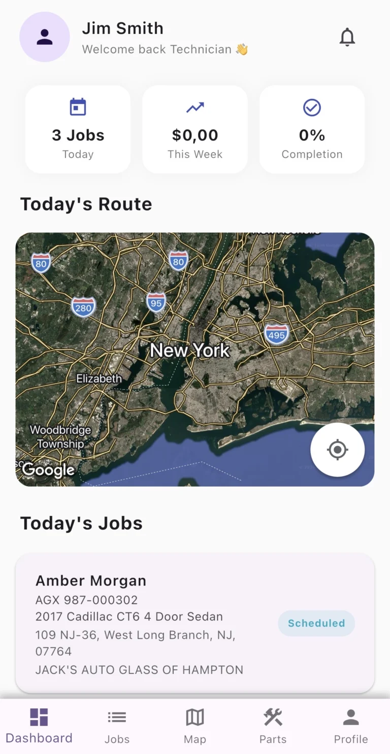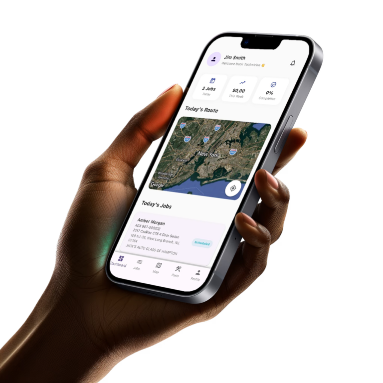 Technicians receive job assignments instantly with all necessary details — location, vehicle info, and required glass.